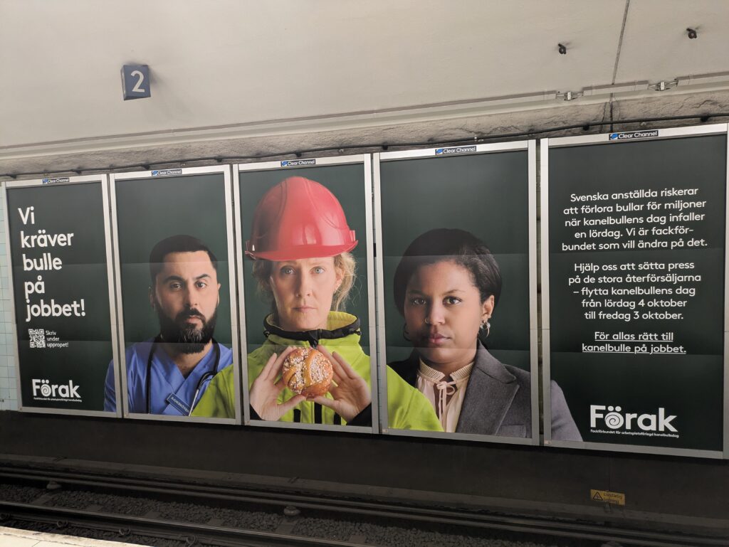 I was very surprised to see this billboard in the subway during the last week of September: a coalition of labour unions advocating for cinnamon bun delivery at work as a BASIC HUMAN RIGHT, even when cinnamon bun day (October 4) lands on a weekend day. Can working conditions in Sweden be so good that the last remaining fights are about cinnamon buns? Is this paid for by the coalition of Swedish bakeries hoping to encourage employers into buying more cinnamon buns?